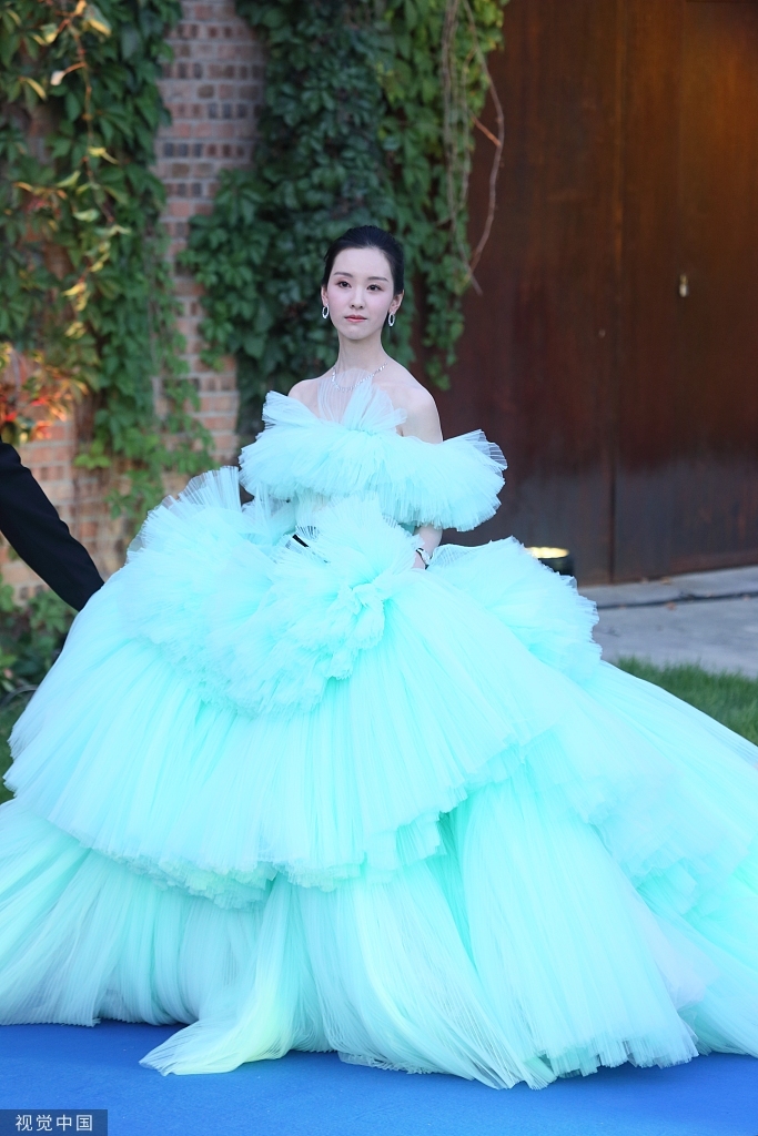 2021年09月30日,北京,第28届大学生电影节闭幕红毯。陈都灵身穿淡绿色蓬松长裙梦幻唯美。