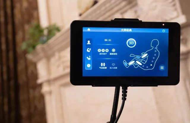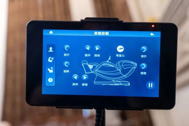 这款高清触摸屏控制面板采用投射式触控电容技术,触控反应非常跟手,触控面板还搭配了支架,触控面板可以取下来操作,十分贴心。所有的信息不论是正在按摩的区域或者剩余时间也一目了然,同时也可以随时调节按摩力度、热敷等功能,相比其它按摩椅配套一个【小按键+小屏幕】的传统遥控器操控模式,这个触控版也是尽显高级,清晰明了,一看就懂。