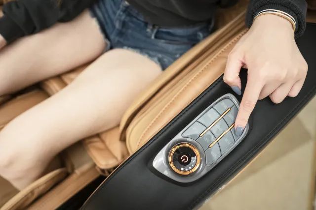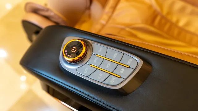 上图是【O-Drive扶手旋钮按键】,点击开关即可开启或者急停,旋钮可以控制3D按摩力度,下方按键可以控制所有姿态:不论是背部俯仰、还是腿部的升降都非常方便,即使老人使用也没有难度,可以轻松上手。控制按键的设计有点像汽车中控,用的时候就在想,按摩椅能否装到汽车后排,长途行车的时候后排座位肯定非常舒服。