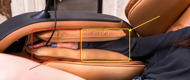而其它气囊的设计也是非常细节,手部这里就分成了两块区域分开挤压,可以专门指压酸累的鼠标手,非常贴心。这里提醒一句,如果有佩戴手表的用户,还是需要先取下手表再进行按摩,否则可能会有不适。