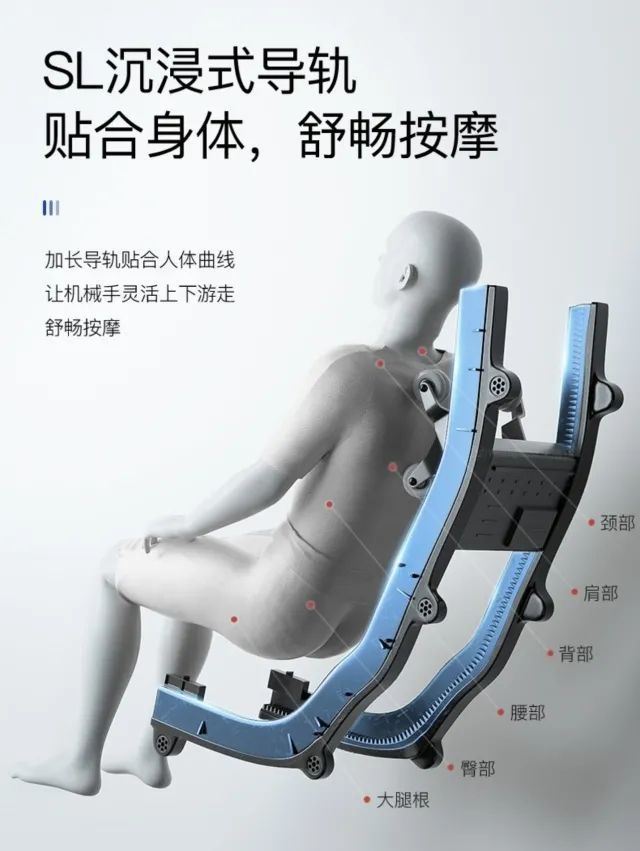 配合135cmSL 形轨道,升级 Detect Pro 体型检测,机械手从颈部到大腿根都能按摩到位。