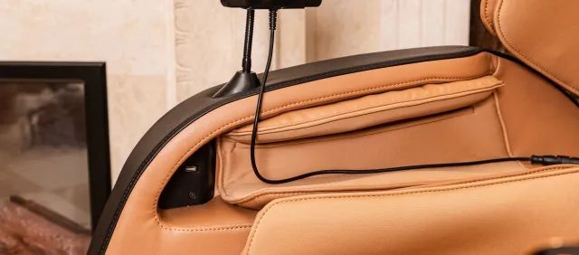 西屋高端按摩椅S700的头枕两侧各有一个蓝牙音响,右侧手部按摩区域前面有个 USB-A 的接口,可以给移动设备充电,原本我想的是可以取下触摸屏控制面,挂上个 iPad 一边按摩一边看剧看电影啥的,毕竟上方的蓝牙音响几乎无延迟,音质也不错,可后来一想,按摩还是得闭上眼睛感受一下片刻的放松。