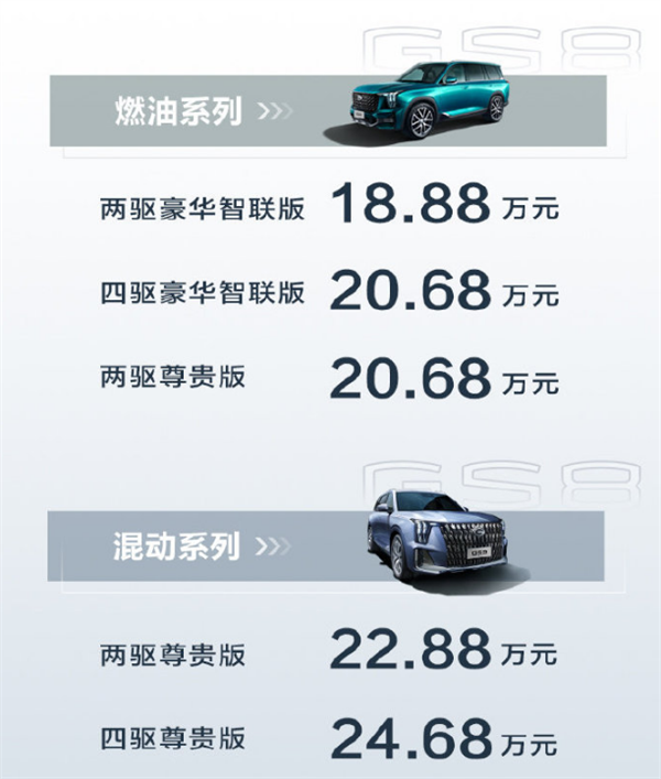 10月1日,全新广汽传祺GS8正式公布了预售价:燃油版共3款车型,预售18.88-20.68万;混动版共2款车型,预售22.88-24.68万。