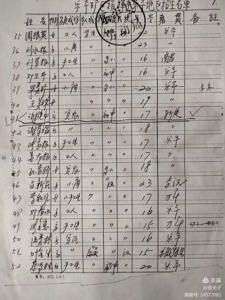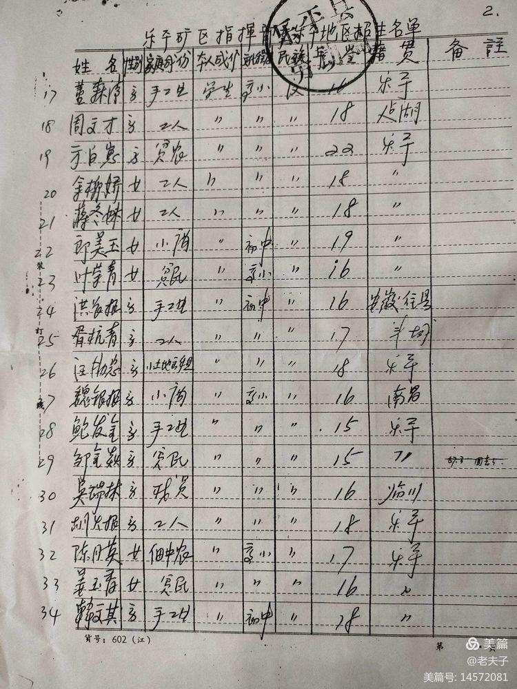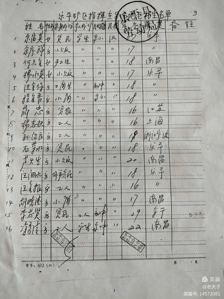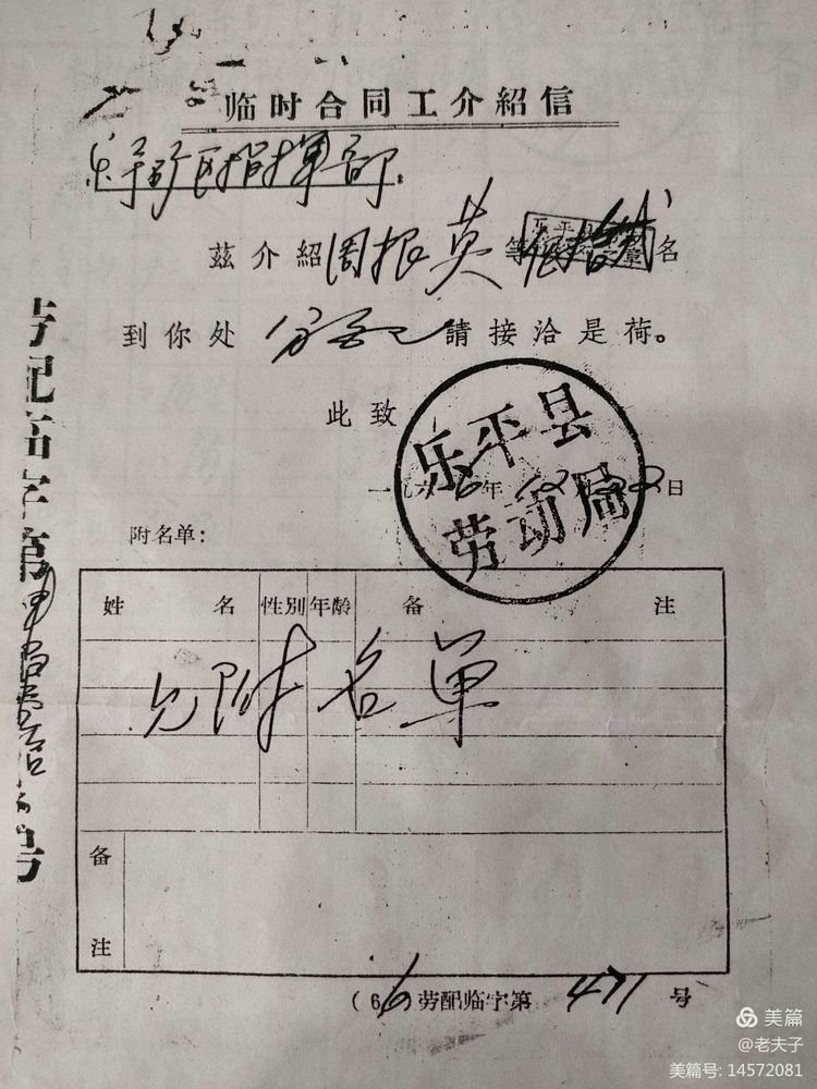 1966年在乐平招收50名工人时,‘’乐平劳动局‘’开具的招工介绍信及花名册。