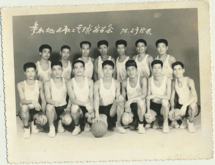 1976年4月厂男子蓝球队赴德兴县参加上饶地区蓝球赛合影。(照片由汪金根提供)