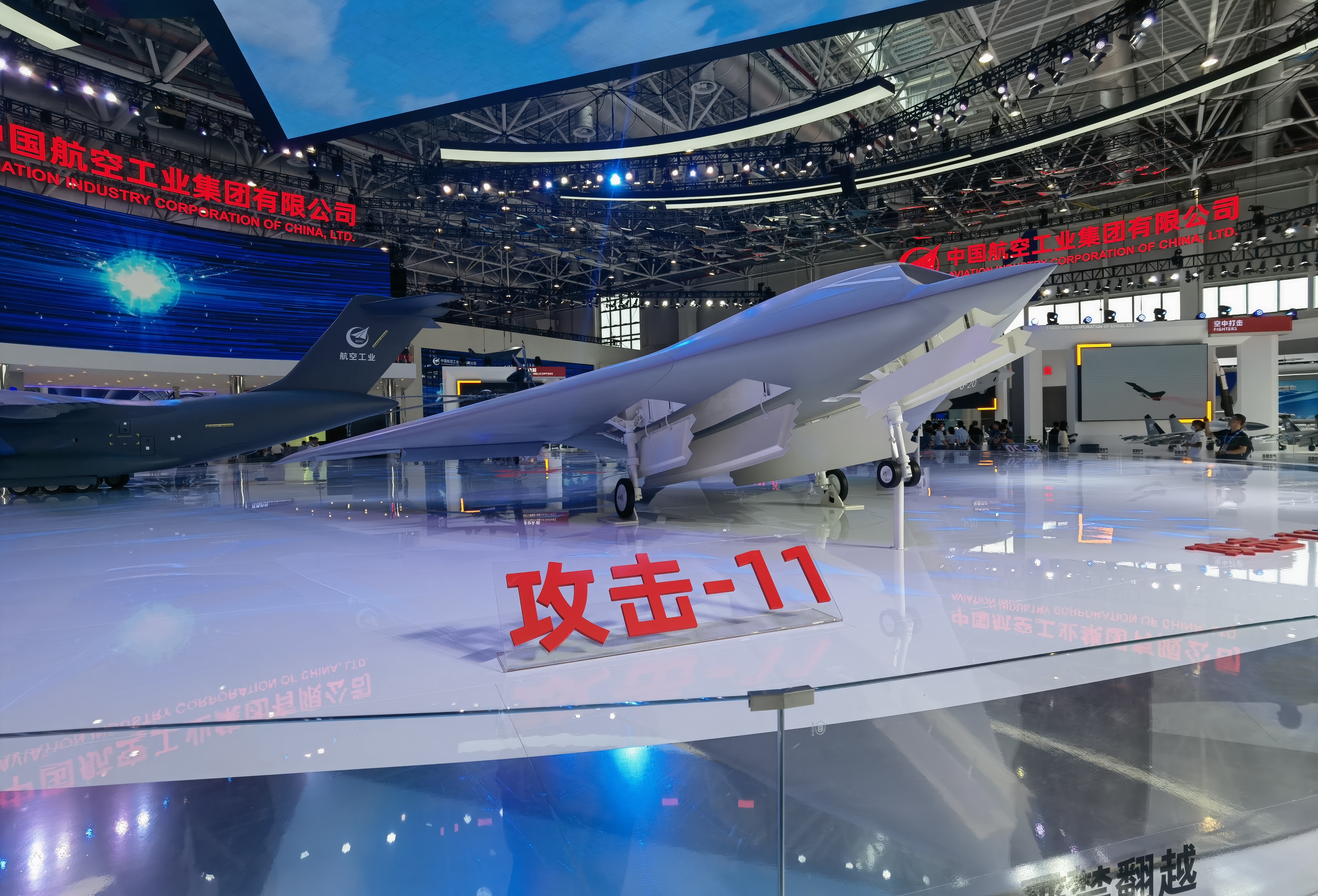 室内展区方面,在航空工业展厅最引人瞩目就是位于展厅中央的大型旋转展台,上面摆放着“20”家族主要成员的缩比模型:歼-20、运-20、直-20以及攻击-11无人机。其中,首次亮相珠海航展的攻击-11无人机还展示了机腹的两个弹舱。