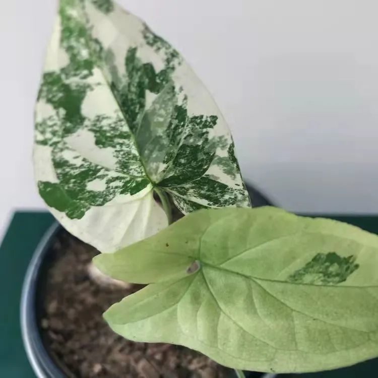 合果芋叶片上的白锦也会出现在不同的位置,有时候甚至会出现叶子上一边是白锦,一边是白色和浅绿色的斑块。