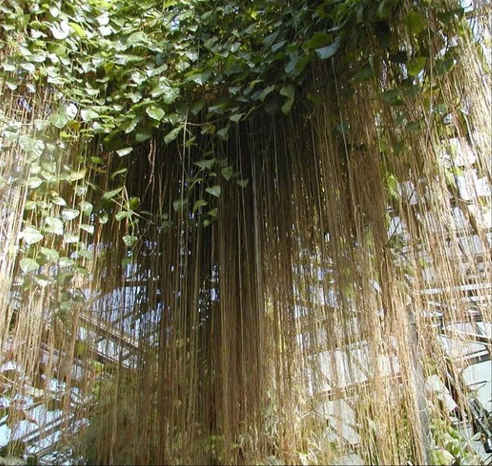 锦屏藤也叫“一帘幽梦”,它一般是被养成景观植物,它可以养在花架上,它可以爬满一大片,而它的气生根就会低垂下来,长得特别长,如果它的气生根长满一大片,看起来就如同一大片的人工帘子般,是极其震撼的。