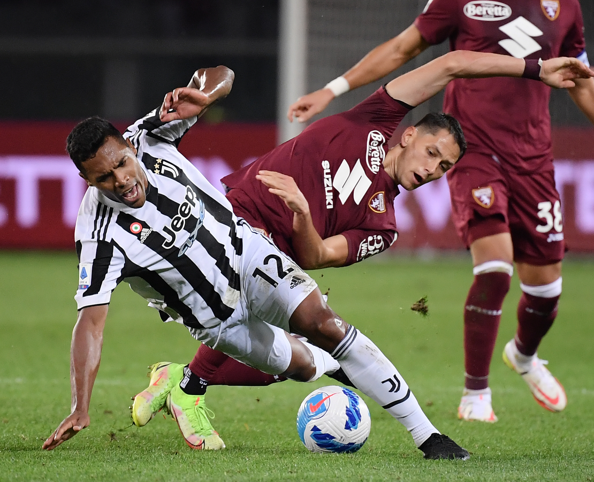 10月2日,尤文图斯队球员阿莱士·桑德罗(左)与都灵队球员萨萨·卢基奇在比赛中拼抢。新华社发(费德里科·塔尔迪托摄)
