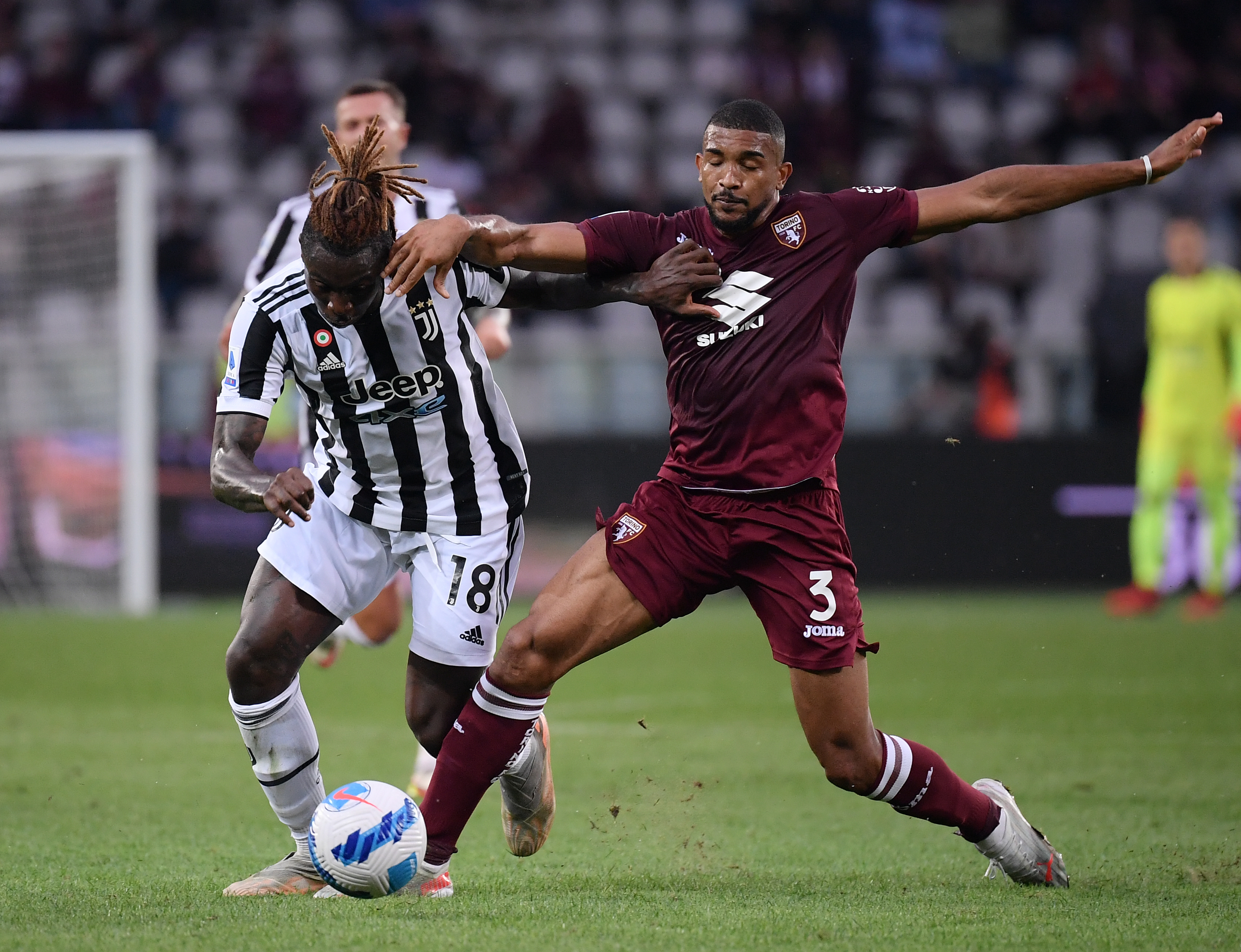 10月2日,尤文图斯队球员莫伊塞·基恩(左)与都灵队球员布雷默在比赛中拼抢。新华社发(费德里科·塔尔迪托摄)