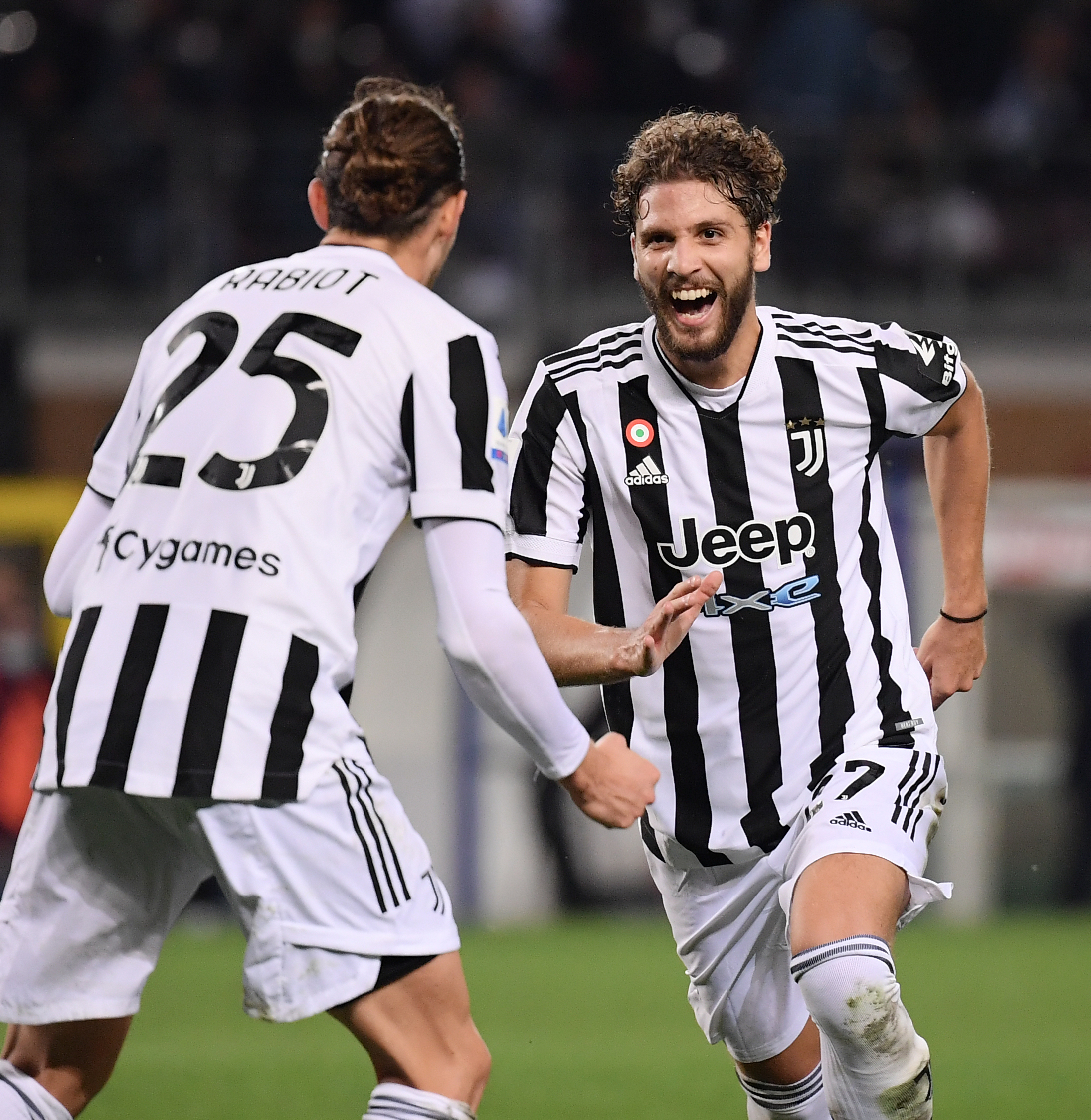 10月2日,尤文图斯队球员洛卡特利(右)进球后和队友拉比奥特庆祝。新华社发(费德里科·塔尔迪托摄)