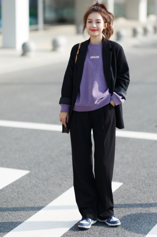 干练的西装搭配卫衣,兼具优雅和休闲气质,这种黑色西装穿在外面,看起来非常潇洒,和里面搭配的紫色卫衣对比起来,黑色和紫色的撞色搭配也很洋气。