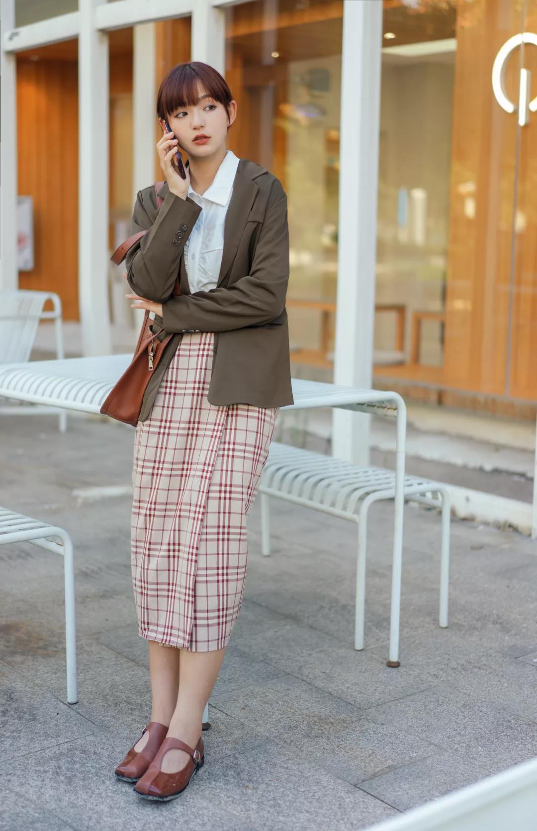 关于西装,大家应该也尝试过很多不同的穿法吧,像下面这种西装就结合了白色衬衫的搭配,很有层次感,也不会觉得拘束,白色衬衫和外面的西装颜色上形成了强烈的对比,看上去更加时尚。下半身搭配复古的格纹半身裙,也能够为你的气质加分,而且包臀的裙装可以修饰腰臀比,看上去还蛮性感的。