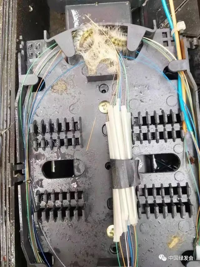 早在2012年前后,绿会志愿者曾经反映过关于美国白蛾的幼虫对于通讯光缆造成故障的例子。它们就挤在光纤信号传输盒里面,密密麻麻,盒子的缝隙周围还有很多在争先爬入。而这一幕正是一位此前在河北省从事光缆维护的工作人员亲眼所见。但是没有留下照片。
