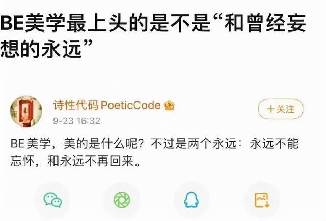 甜剧的结局在最后一集,BE剧的结局永远在戏外。BE党在积极搞糖的全民CP时代多少显得有些不一样,一句「到底意难平」会让他们持续保持解读和二次创作的源动力。