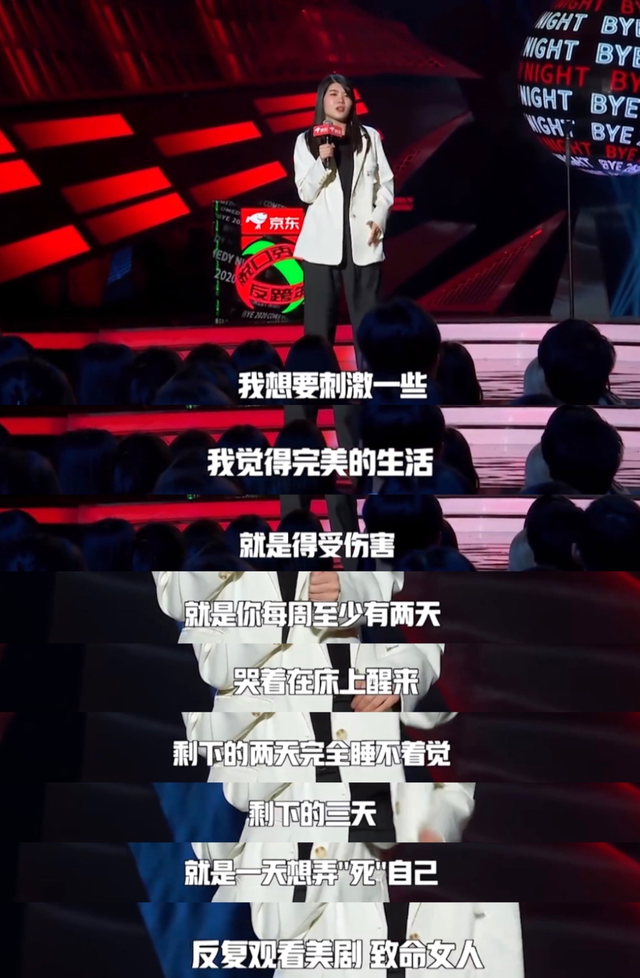 杨笠曾经在《吐槽大会》说过这样一个段子:“我想要刺激一些,我觉得完美的生活就是得受伤害。完美的生活,就是一周有两天哭着从床上醒来,剩下的两天完全睡不着觉,剩下的几天就是想弄死自己,还有一天反复观看《致命女人》。”