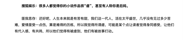 这种痛苦的必要性渐渐被影视创作者们挖掘,被誉为“悲情天后”“虐心教主”的编剧、作家匪我思存,手握《寂寞空庭春欲晚》、《佳期如梦》、《千山暮雪》、《东宫》等多部BE剧集的战绩,这位“后妈”在接受采访时表示:“人生本来就是有苦有甜,我们这一代人,活在太平盛世,几乎没有见过多少苦难,爱情里受一点伤,算是难得的历练。”