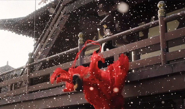兵临城下,漫天飞雪,女主一袭红衣从城墙上纵身一跃,就问你美不美?这画面、这场景可以刻在我心里一辈子了吧。