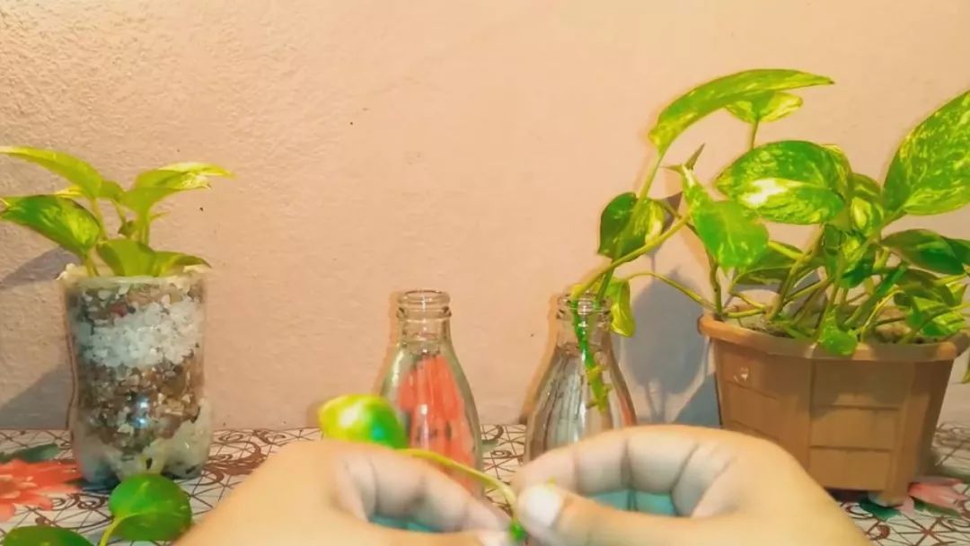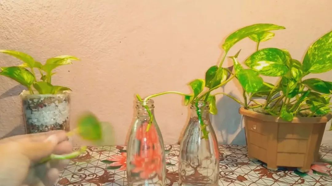 剪下来的枝条可以用水培的方法来促进生根,将枝条底部浸泡在水中,叶柄可以稍稍浸泡在水里,最好是用玻璃容器,根系长出来之后也能及时检查到。注意,绿萝的叶子不能浸泡在水里。
