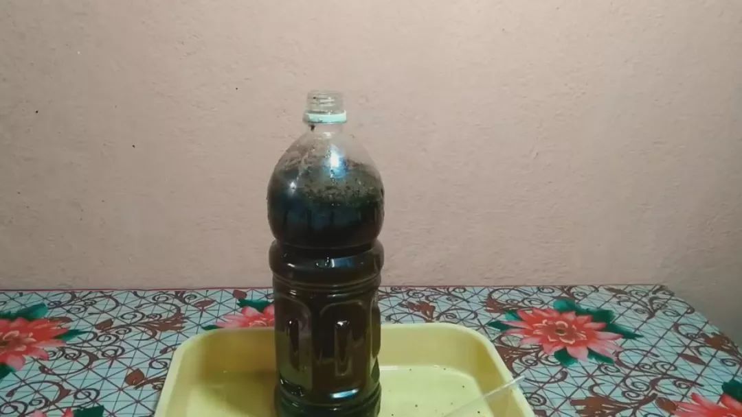 放了三五天之后就能变成非常肥沃的有机液肥了,底部会有沉淀。摇晃均匀后,就可以将这些有机液肥倒出来。