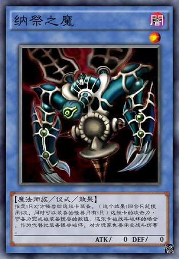 这个卡名的①②的效果1回合各能使用1次。①把这张卡从手卡丢弃,以对方场上1只效果怪兽为对象才能发动。选自己场上1只眼纳祭神融合怪兽或者纳祭之魔把作为对象的对方的效果怪兽当作那个效果的装备卡使用来装备。这个效果在对方回合也能发动。②场上有眼纳祭神融合怪兽或者纳祭之魔特殊召唤的场合发动。墓地的这张卡加入手卡。