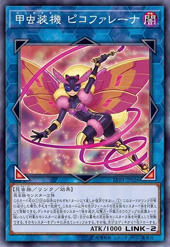 昆虫族怪兽2只;这个卡名的①②的效果1回合各能使用1次。①这张卡连接召唤成功的场合,丢弃1张手卡,以这张卡以外的自己场上1只昆虫族怪兽为对象才能发动。从卡组选1只昆虫族怪兽当作攻击力·守备力上升500的装备卡使用给作为对象的怪兽装备。②以自己墓地3只昆虫族怪兽为对象才能发动。那些怪兽加入卡组洗切。那之后,自己从卡组抽1张。