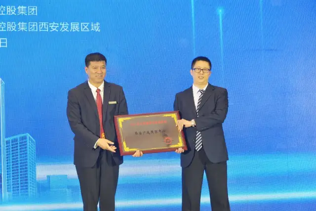 孙晓一现场为西安广成国际中心项目授“2021西北高端综合体新地标”牌,甘肃省新世纪投资控股集团副总经理、西安发展区域董事长接牌。