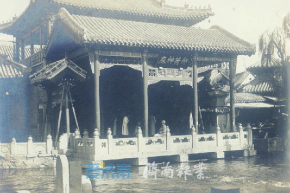 从另一张较为罕见的20世纪20年代末的照片中可见,当时的虎头仅为一个,这也是《老残游记》第三回《金线东来寻黑虎 布帆西去访苍鹰》记载的黑虎泉只有一个虎头的样貌:“(老残)进了茶馆,靠北窗坐下,就有一个茶房泡了一壶茶来。……老残坐定,问茶房道:‘听说你们这里有个黑虎泉,可知道在什么地方?’那茶房笑道:‘先生,你伏到这窗台上朝外看,不就是黑虎泉吗?’老残果然望外一看,原来就在自己脚底下,有一个石头雕的老虎头,约有二尺余长,倒有尺五六的宽径。从那老虎口中喷出一股泉来,力量很大,从池子这边直冲到池子那面,然后转到两边,流入城河中去了。”