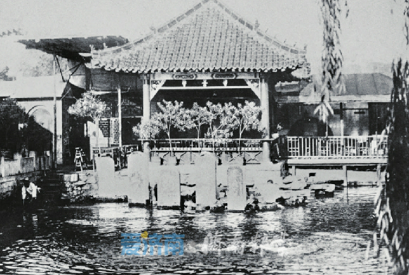 上世纪20年代从东往西拍摄的趵突泉照片显示,泉池周边显得有些杂乱,亭阁旁有残破的棚子,池岸也不整齐,倒是池中的4块石碑显示出些许古意。