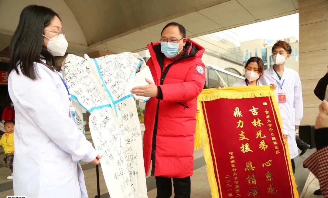 哈尔滨市举行欢送仪式,哈尔滨市人民政府、哈医大二院向吉林大学中日联谊医院医疗队送上锦旗,感谢医疗队为哈尔滨抗击疫情核酸检测工作作出的努力和贡献。仪式现场,该院医疗队回赠带有队员签字的院旗及防护服,共同记下一起同心抗疫的日日夜夜。