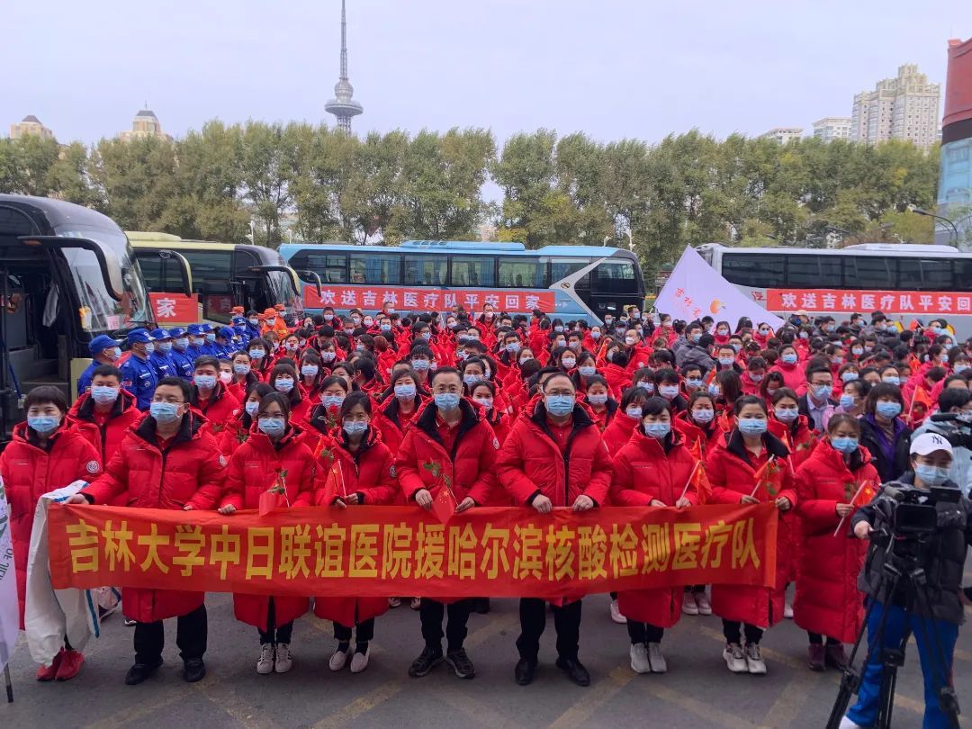 10月6日12时许,吉林大学中日联谊医院援助哈尔滨核酸检测医疗队111人完成使命,启程归家。