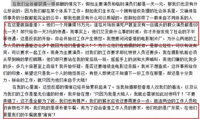 李连杰曾接受采访中提到,内地演员和香港演员,区别对待,同工不同酬,他作为主演一天3块钱,而香港演员扮死尸的龙套就能拿50元。