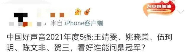 其实熟悉《中国好声音》的观众都知道,它一直采取的是“先录后播”的模式。因此虽然现在正片仅出炉了十一强名单,但五强名单早已经在网络上传得沸沸扬扬了。五强选手分别是:王靖雯、姚晓棠、伍珂玥、陈文非、贺三。