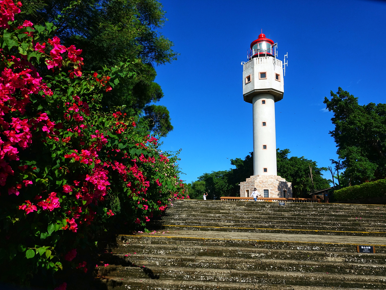 火山地质公园入口处是涠洲灯塔。灯塔位于涠洲岛之巅,建于1956年,原为铁架结构,1969年改建为石塔,2002年重建,新塔高22米,外侧面贴白色仿石砖,游人可登塔极目远眺全岛风光。
