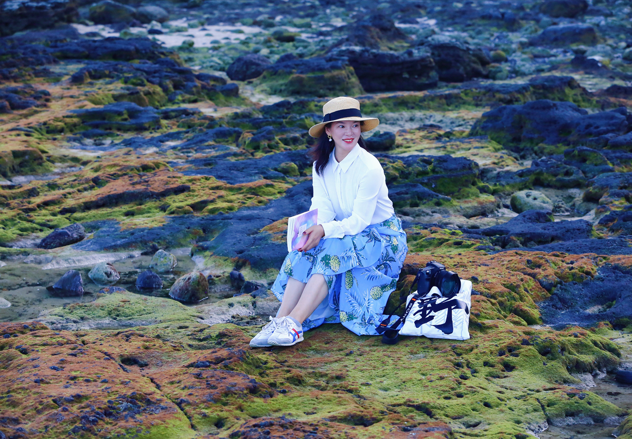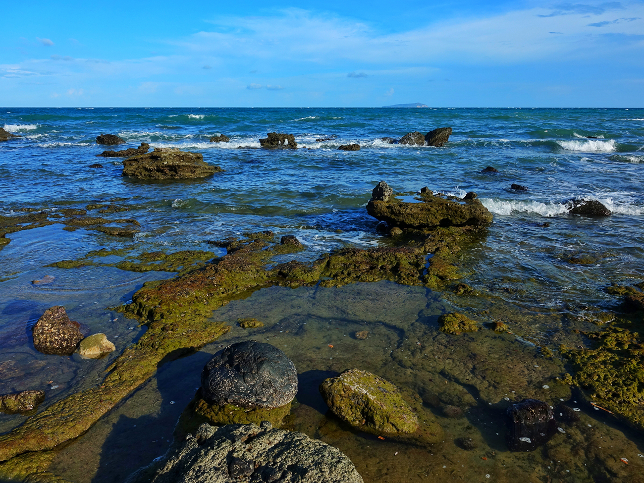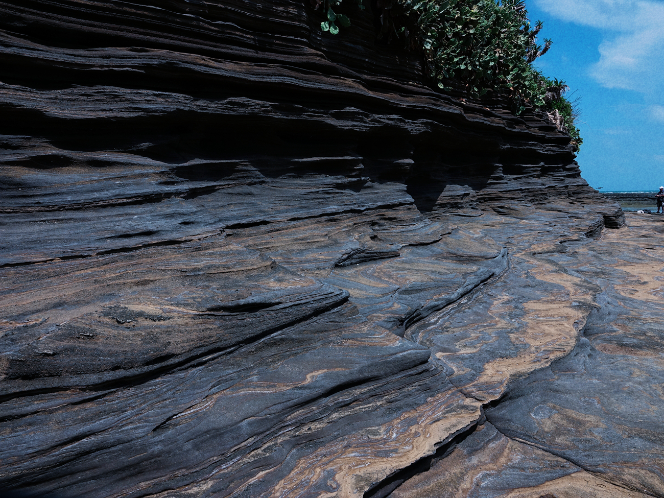 五彩滩原名芝麻滩,因为沙滩上有许多像芝麻一样的黑色小石粒。退潮后的芝麻滩是其高光时刻:巨大的火山岩石层次分明,仿佛老树桩的年轮般,非常震撼。