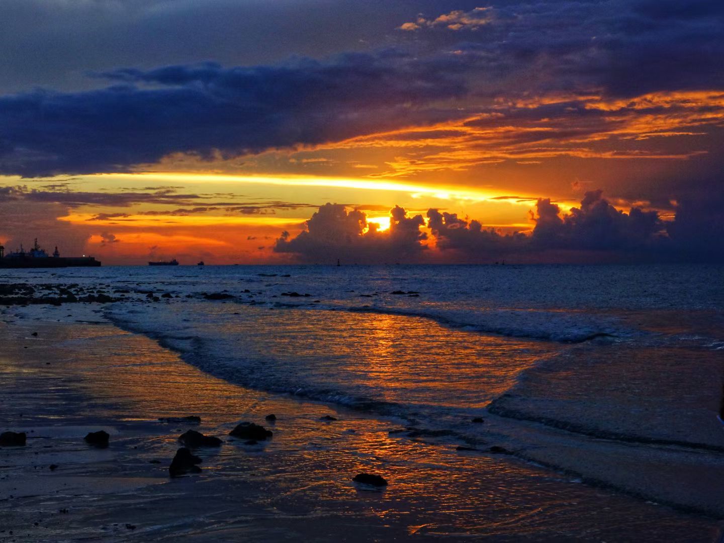 因为地理位置的原因,在北海市区看日落几乎是不可能的,但是在涠洲岛,只要天气好,每天都能遇见绝美夕阳。大约在18点左右,晚霞开始绚烂,海天之际上演一出风起云涌日暮西山的大戏,我端了把椅子,坐在沙滩上,听浪拍沙滩,看夕阳渐渐谢幕,莫名感动。