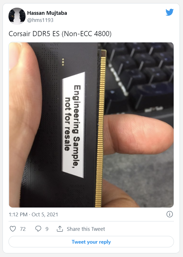 不仅如此,还有海外用户在推特发布了一张海盗船 DDR5 内存样品照片,上面有着“非零售”标签。参数上,这款产品频率为默认的 4800MHz,并不支持 ECC 纠错功能。