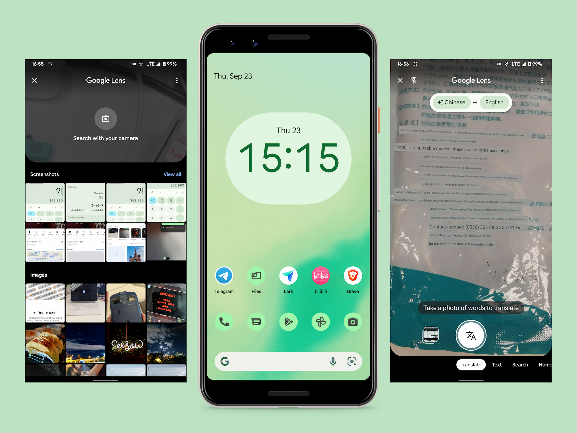 与相机应用类似的,Google Lens 也已部分采用了 Material You 设计,比如取景框中的取字翻译提示。但底部功能标签依然没有跟进动态颜色适配。