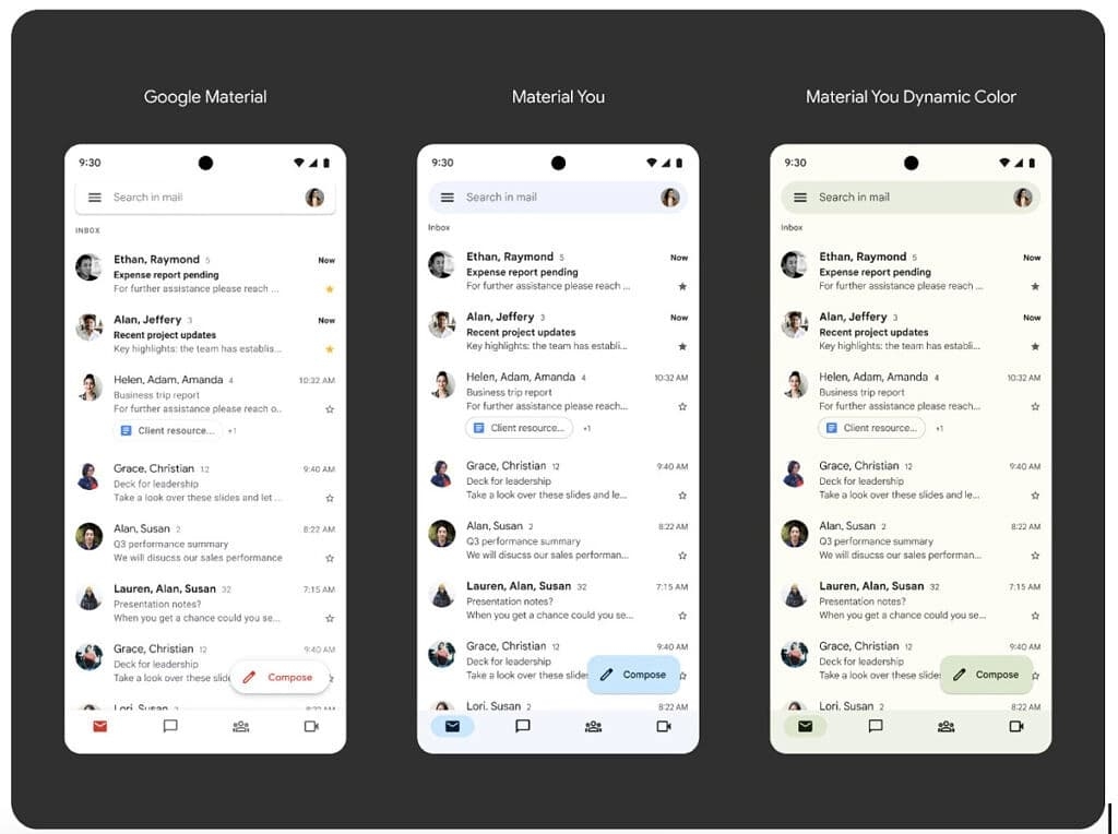 Google Workspace 套件中的其它应用,如 Gmail、文档、表格、幻灯片等,也拥有了较为完整的 Material You 适配,大面积应用的动态颜色、圆角矩形样式的悬浮操作按钮一个不少,Gmail 同时还拥有全新的「四叶草」式动态色彩小部件。