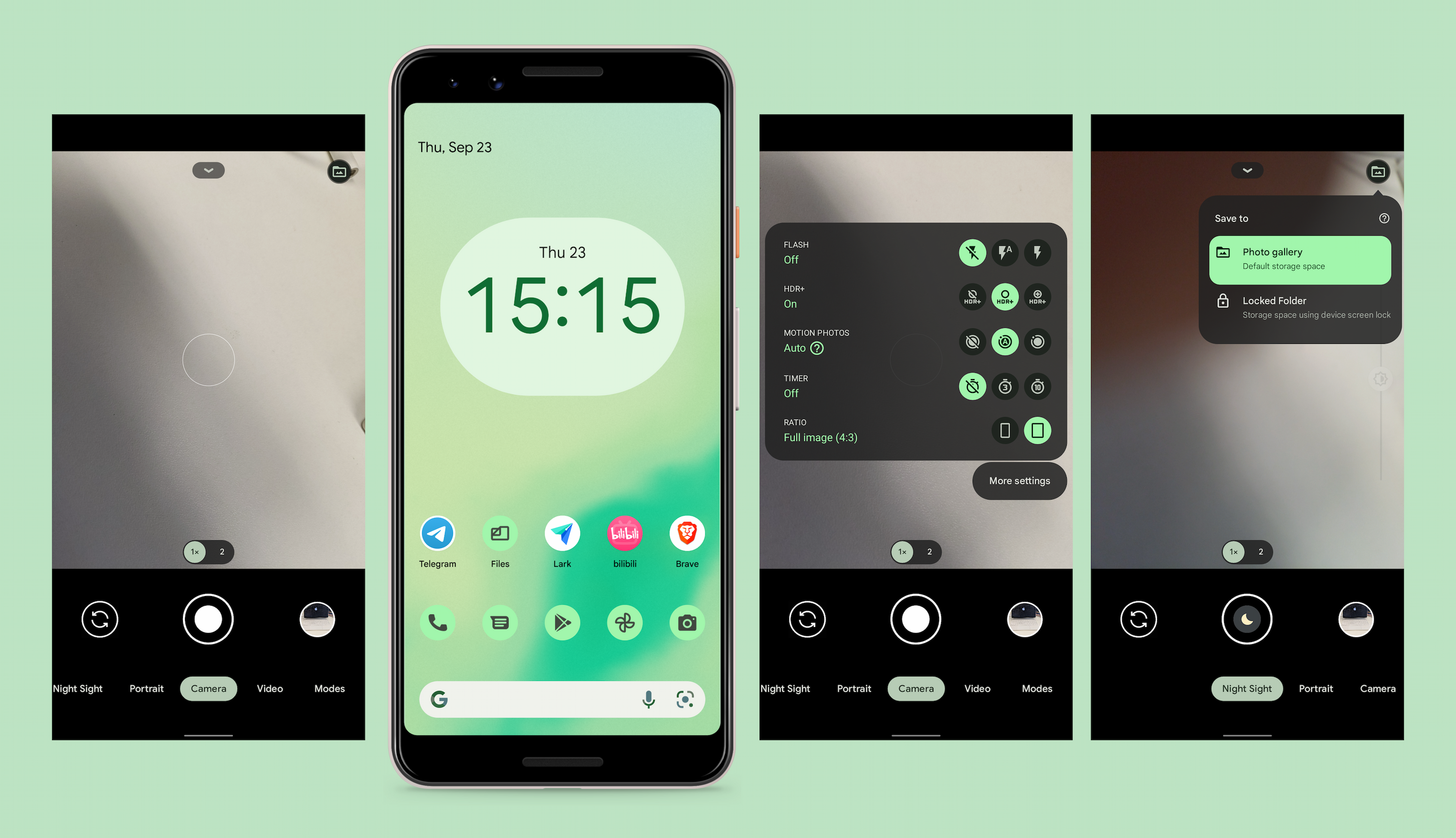在 Android 12 中,相机取景器底部选中的当前拍摄模式会通过采用动态颜色的标签背景进行提示,取景器中的变焦按钮、安全相册开关以及顶部设置面板也都使用了统一提取到的动态颜色来呈现选中效果。