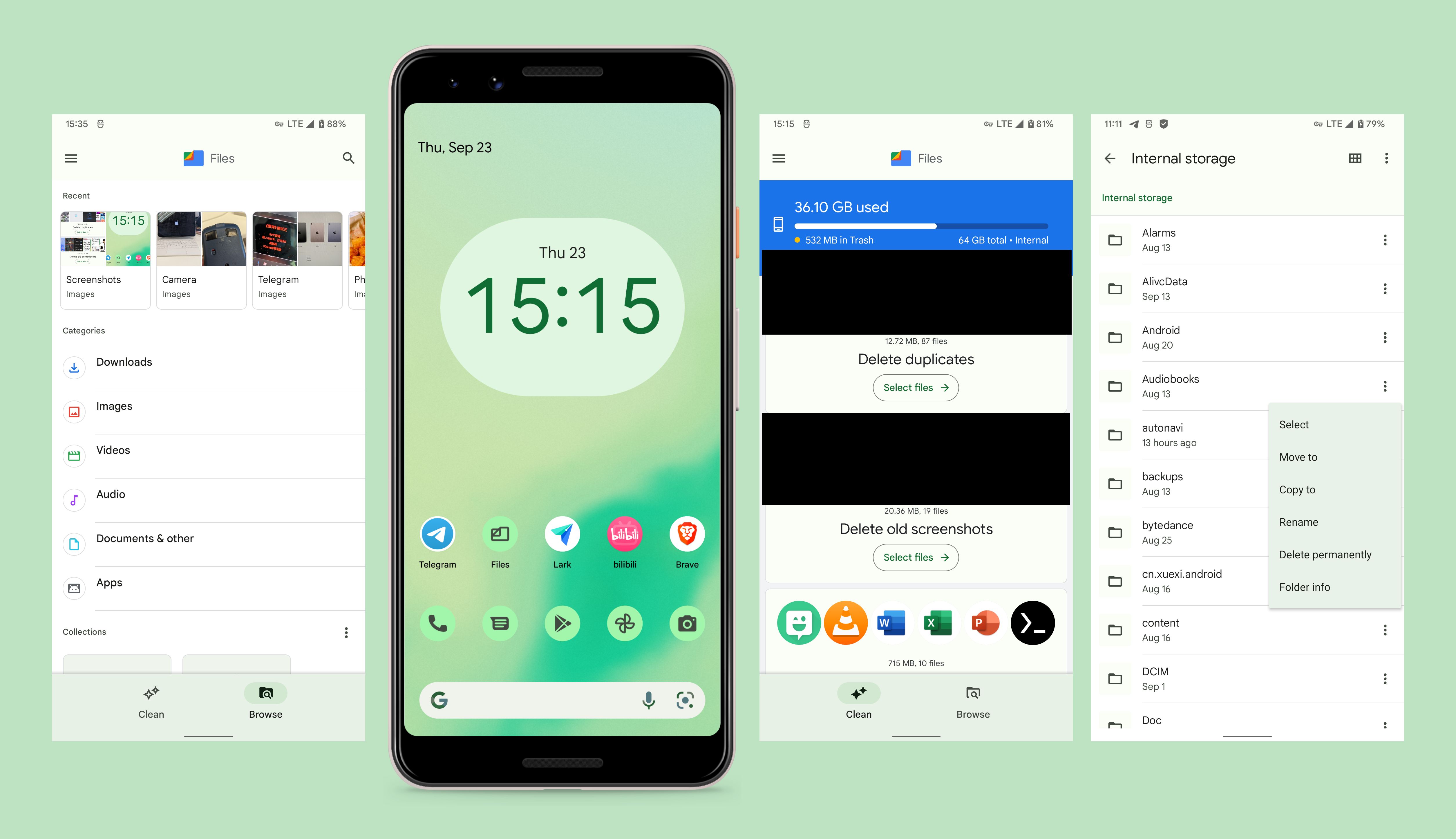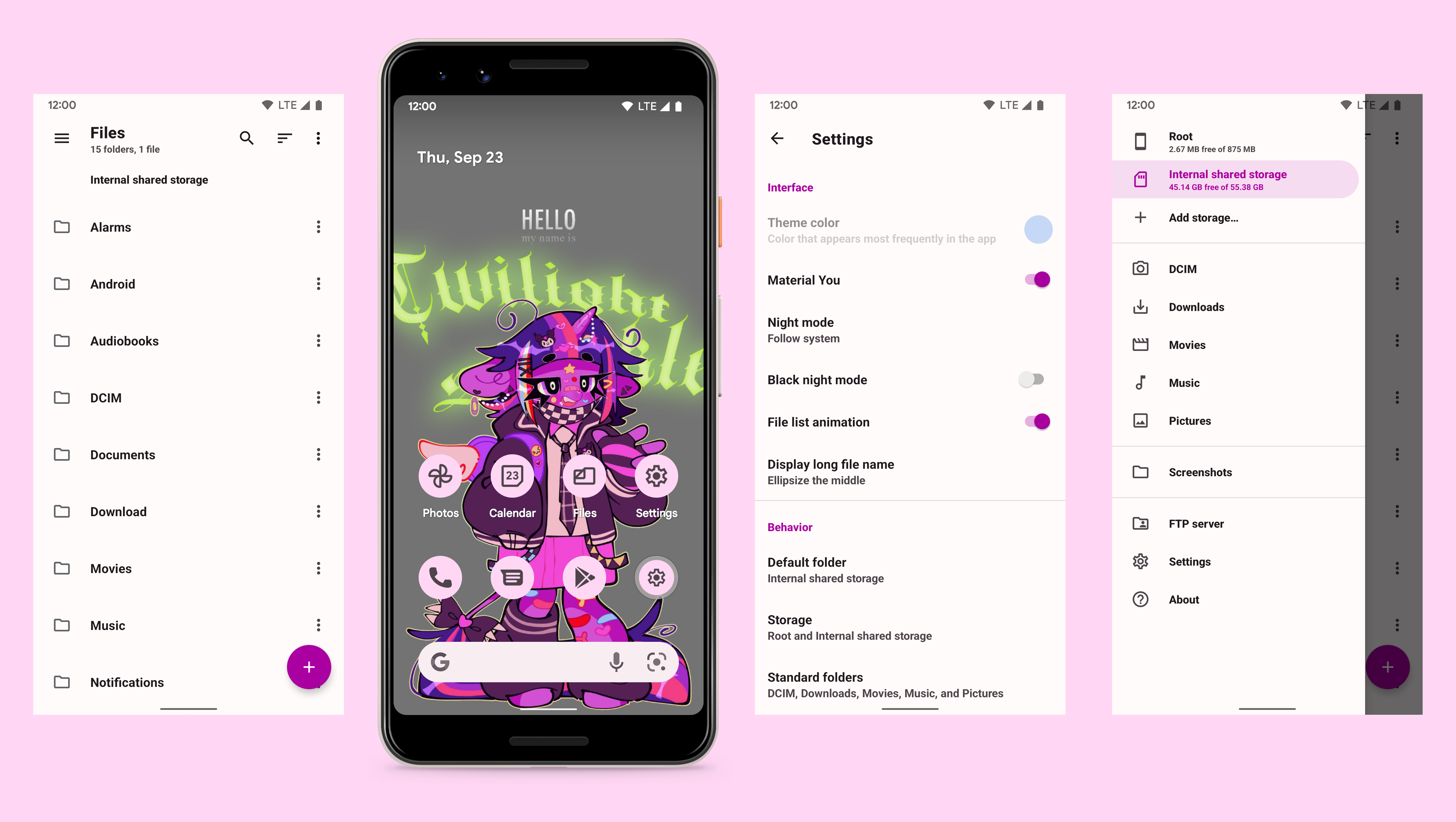 虽然从设计规则上来说文件极客可以说是 Google 自家应用中「打脸」一般的存在3,但这款应用依然跟随 Android 12 进行了 Material You 动态颜色的提取和应用,包括主界面的清理操作按钮、文件浏览界面的弹出菜单、底部导航栏的导航图标和导航图标选中背景等。
