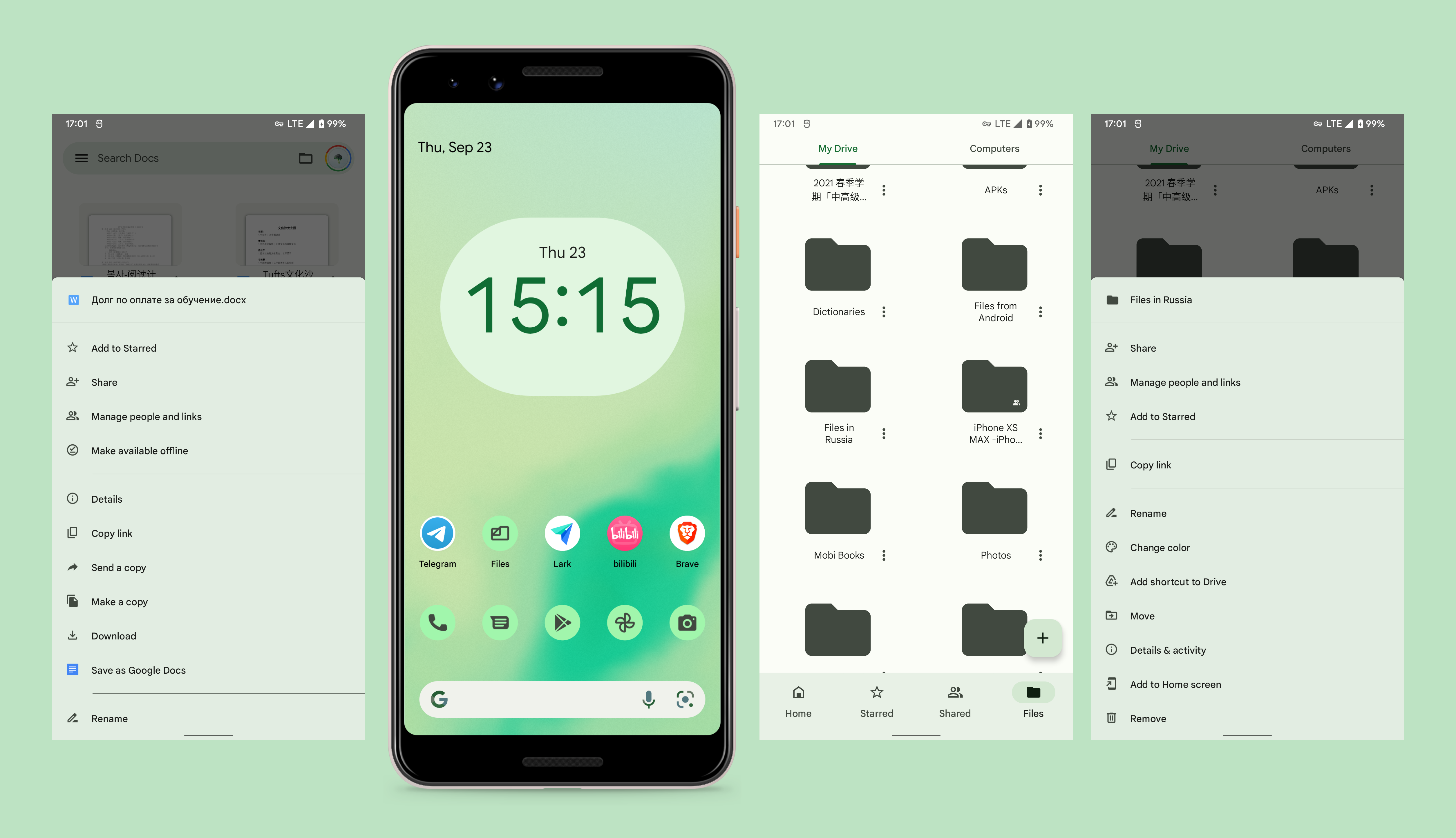 虽然依然保留了左侧导航抽屉,Google Drive 在可以的地方几乎都用上了从桌面壁纸提取到的动态颜色,导航栏、背景、底部弹出菜单、搜索框等不同界面的层级也通过相近色的变化体现了出来,新版底部导航栏设计和支持动态颜色的桌面小部件自然也没有缺席。