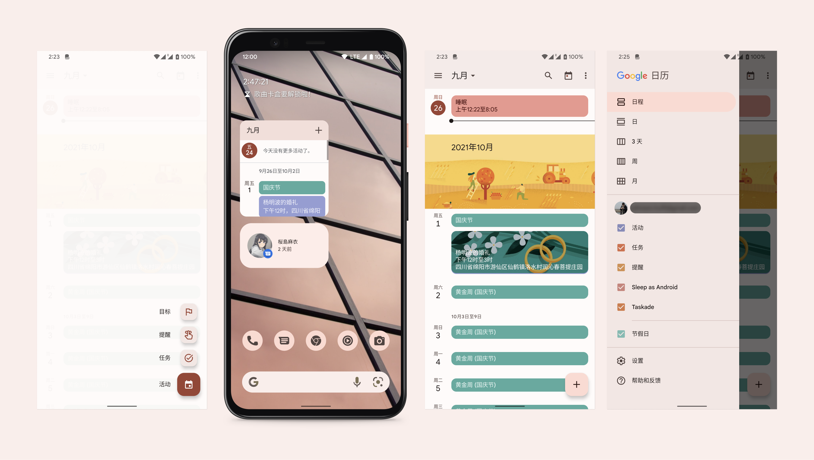 更重要的是,Google 日历在桌面小组件中也同样运用了 Material You 动态颜色,视桌面摆放位置的不同,小部件标题栏的颜色也会动态改变。总体来说日历应用算是将新设计诠释得比较到位的适配案例之一。