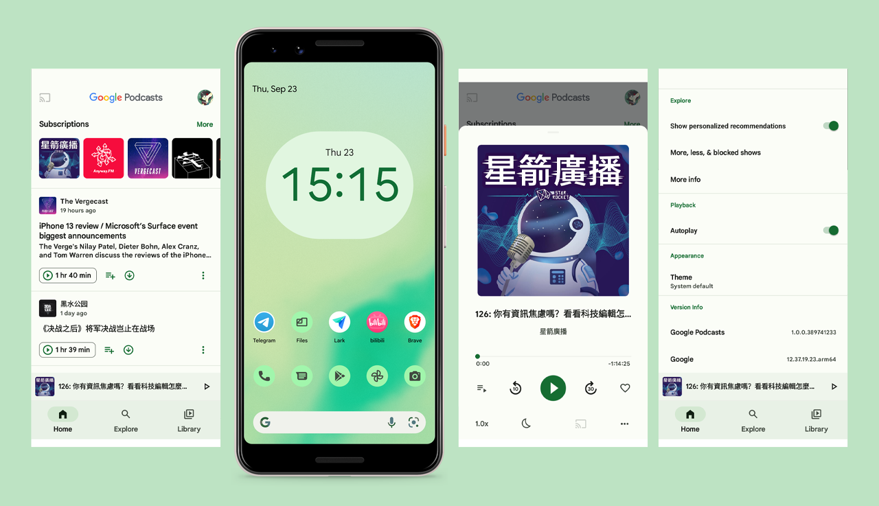 作为 Google 第一方的播客应用,Google 播客也在最近的版本中跟进了 Material You 设计风格,通过大面积应用的动态颜色提升应用与系统界面在视觉观感上的一致性。同时也用上了标志性的新式底部导航栏设计。