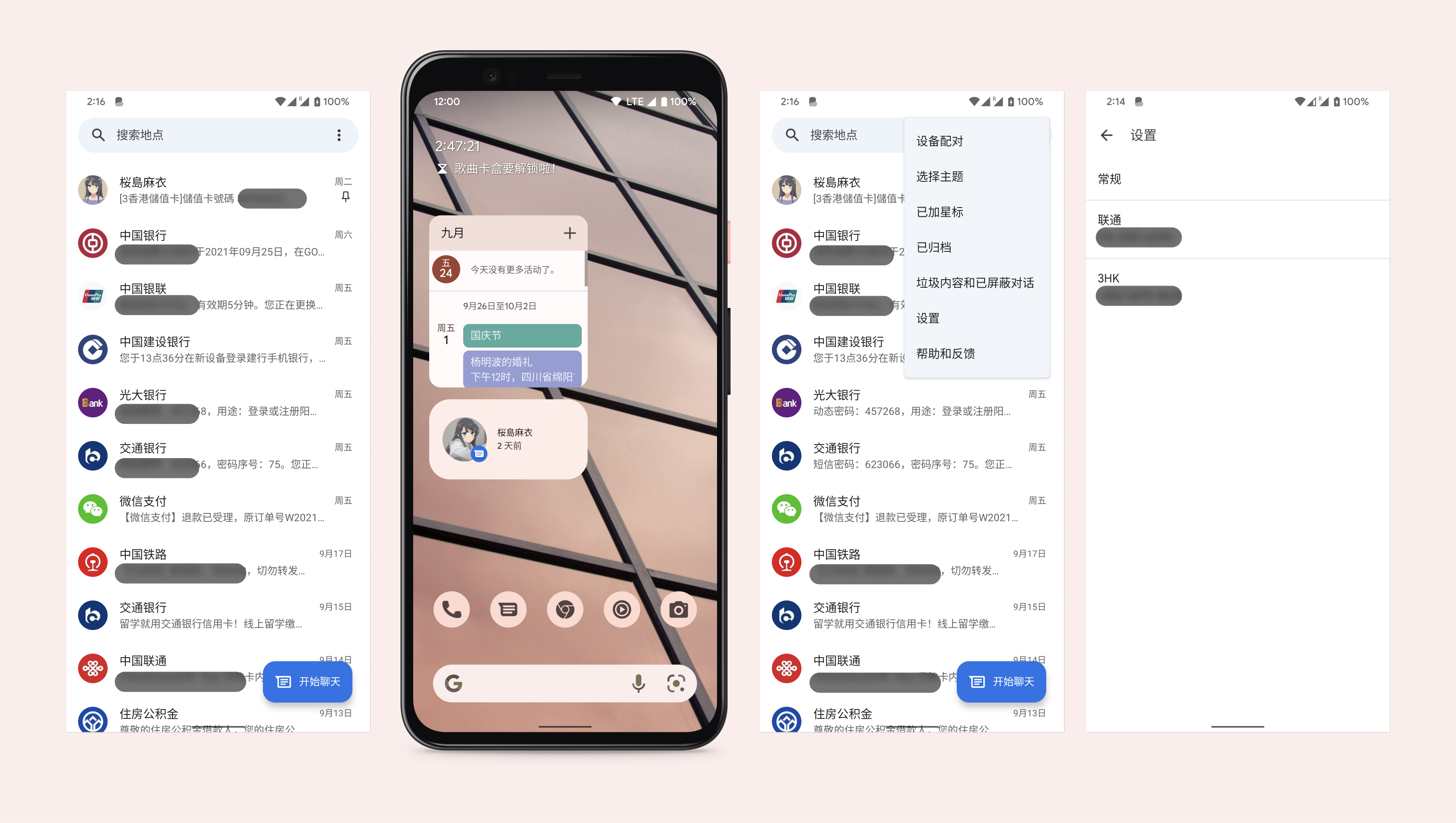 至于信息应用,截至发稿时,Google 仅对应用主界面右下角的悬浮操作按钮进行了更新,同样是由圆变方,在信息列表中滚动浏览时,悬浮操作按钮会根据滑动方向在扩展形态和精简形态间切换;设置项目得到了重新整理,更加清晰明了。但除此之外信息应用的更新就可以说是乏善可陈了,我们甚至看不到半点动态颜色的影子,无论桌面壁纸如何,应用内均采用蓝色为默认颜色。
