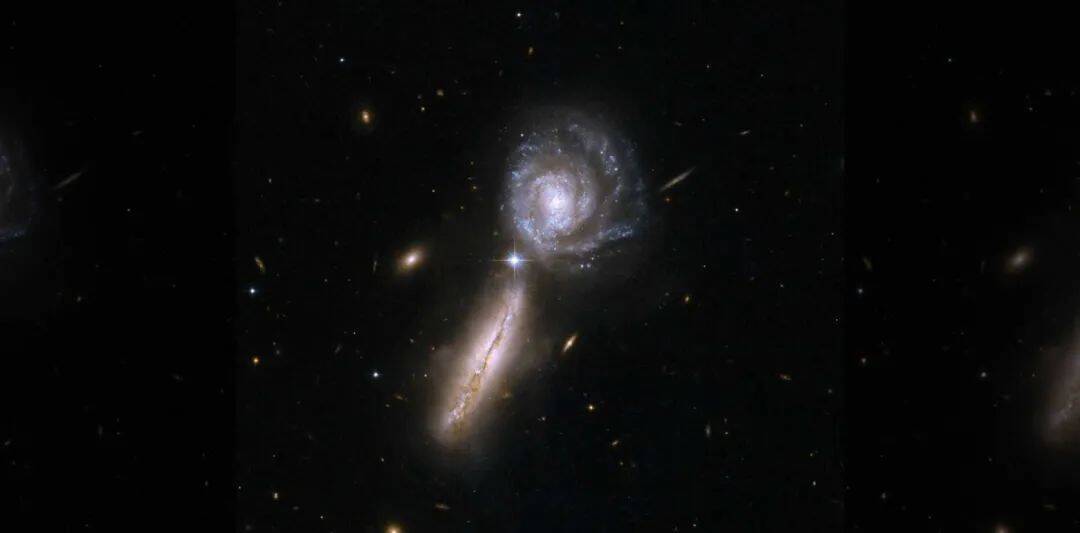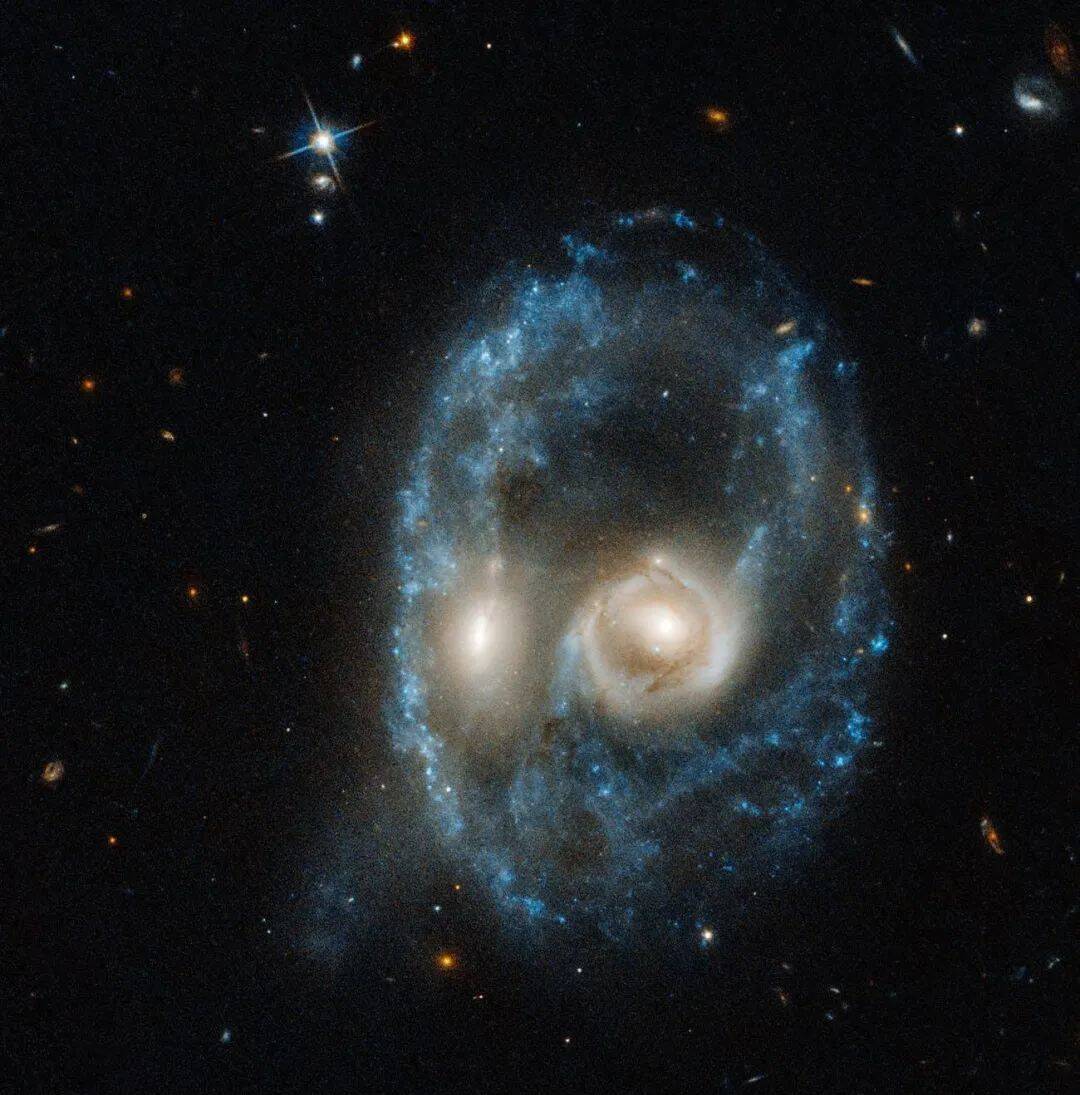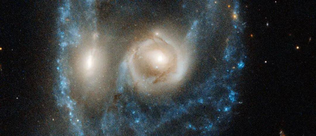 这张照片最初拍摄于2019年7月,它展示了两个星系的相邻核心,两个亮点如同一双眼睛向太空中窥视,被新形成的恒星团所包围,主要由气体、尘埃和恒星组成的星系盘向外伸展。