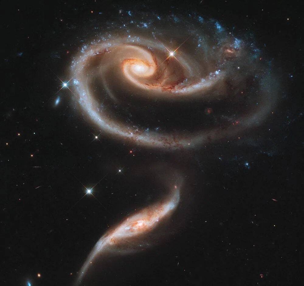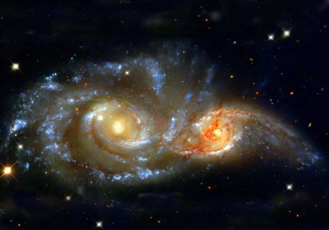 即将相撞的旋涡星系UGC 9618和VV 340。天文学家认为这样的星系合并通常也包括星系核心的超大质量黑洞的合并。(图片来源:NASA/ESA)