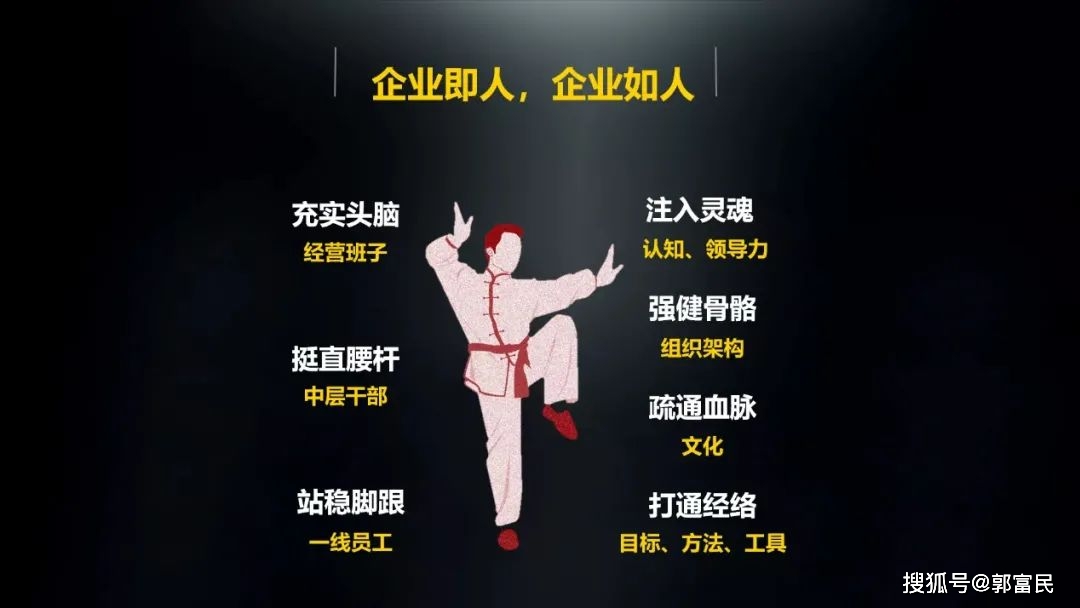 企业就像人一样,有头有脚,有手臂、有腰杆,也有思想,也有灵魂,也可能出现头重脚轻(一线员工机械手)、腰杆不硬(中层干部没有创造力)、头脑不灵(高层领导缺乏智慧)的现象。