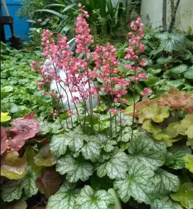 矾根是一种多年生的草本花卉,特别耐阴,它比较喜欢生长在温暖凉爽的环境下,也有较好的耐干旱和耐热能力,它的植株比较低矮,一般只能长到二三十厘米高,它的叶子看起来像天竺葵,花朵如同一个个迷你的小铃铛,它能长出特别高的花梗,花朵特别小,如迷你状的铃铛,花色通常是白色,粉色或红色。