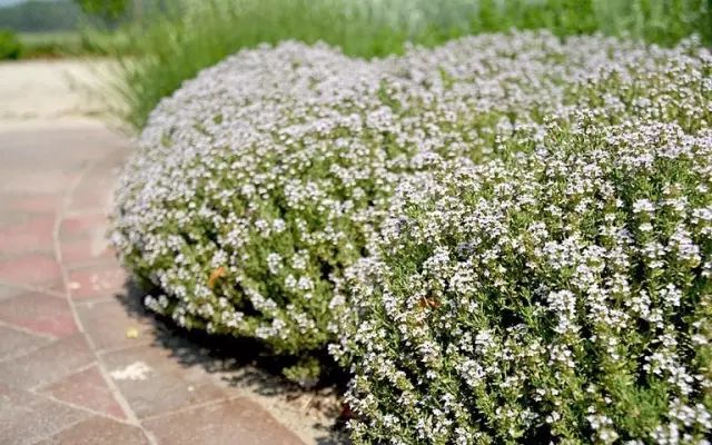铺地百里香特别容易生长,在常年温暖干燥的环境下就长得最好,很适合布置在石板路的旁边,它甚至可以在石缝中生长,对土壤的排水性要求较高,多给一些沙质土,铺地百里香会长得更好。
